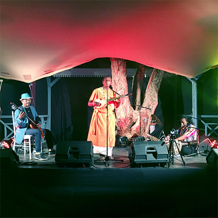 Laxman Das Baul exemplifies the Baul tradition with a voice that is deeply spiritual, singing and accompanying himself with Baul instruments, the Anandalahari and Dotara. He is a disciple and the adopted son of renowned Baul Master and composer Shri Shudhir Goshai. Guitar virtuoso Eric Triton with his universal blues flavoured with Mauritian Creole spice, alongside Shakti Shane Ramchuran, brilliant and soulful master of tabla, delivering an irresistible musical genre: Afroriental Blues. The Eric Triton + Lakshman Das Baul project is a collaboration of musical styles, contexts and cultures, and is supported by EarthSync India and Jorez Box, Mauritius.